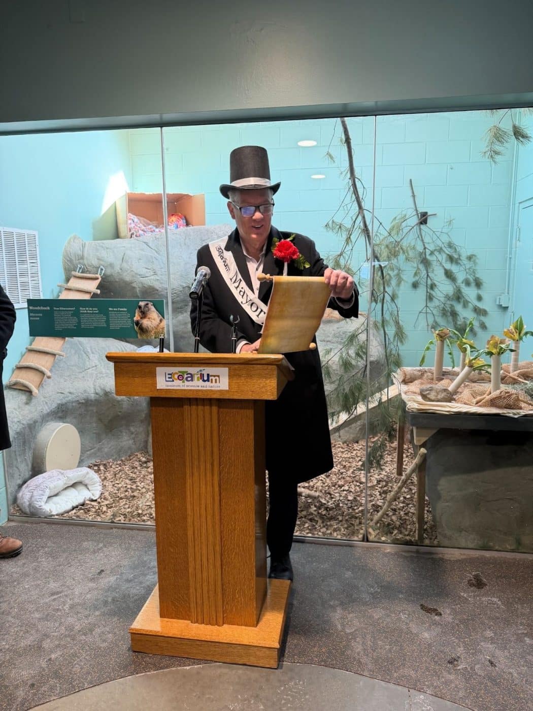 “Today, Cornelia has emerged from hibernation to search the ground at the EcoTarium for her shadow, as, like her ancestors before her, Cornelia has acquired the fascinating ability to predict the arrival of spring with 50% accuracy”, said Mayor Petty with a smile. “I hereby decree that, on this sunny day, Cornelia did in fact see her shadow and thus proclaimed six more weeks of winter weather for the City of Worcester, Massachusetts. I urge all citizens to join in the Groundhog Day celebration across the City, and to keep your hats and mittens close at hand.”